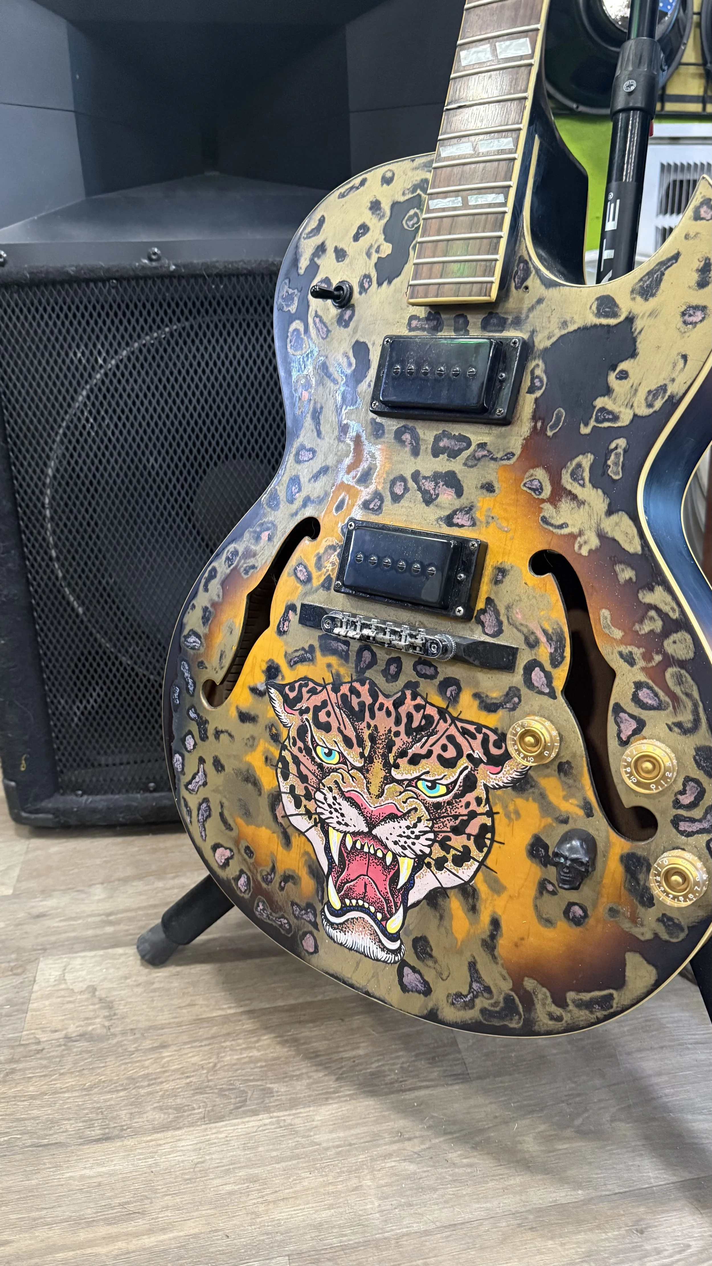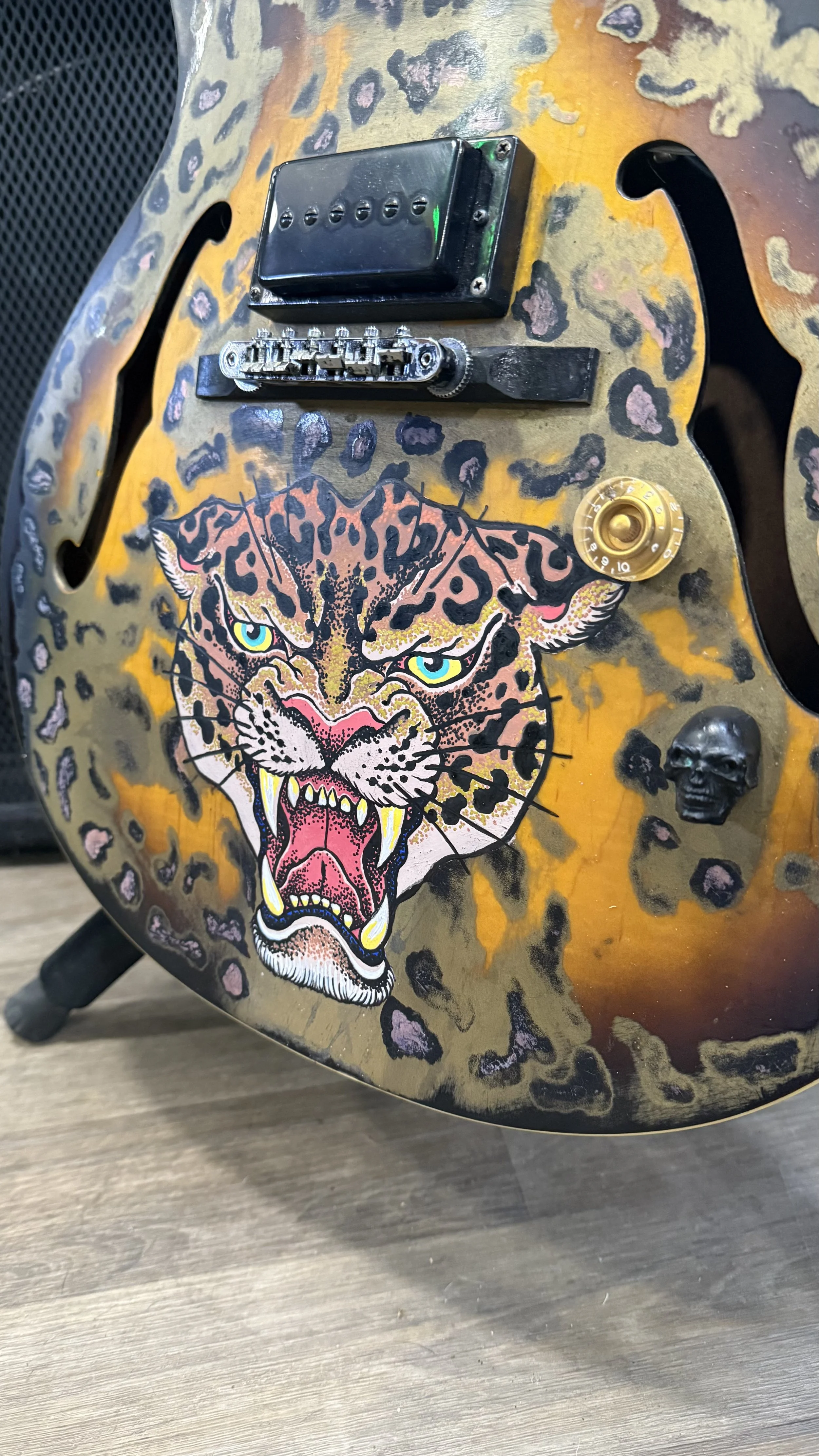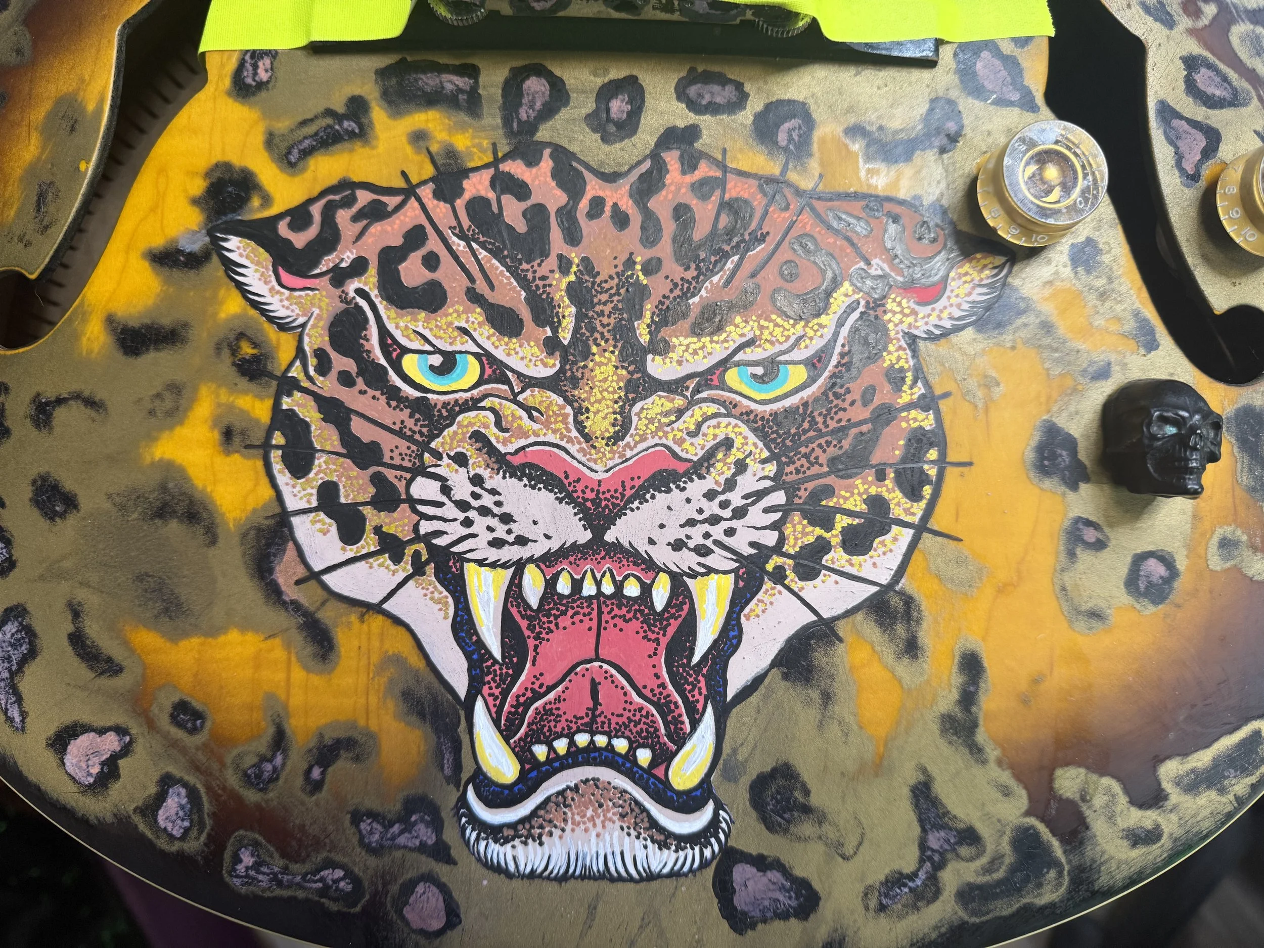Uniquely painted jaguar head for a unique individual. Another Johnny Cockerelle custom painted guitar. Johnny found inspiration from my original tattoo flash for this request