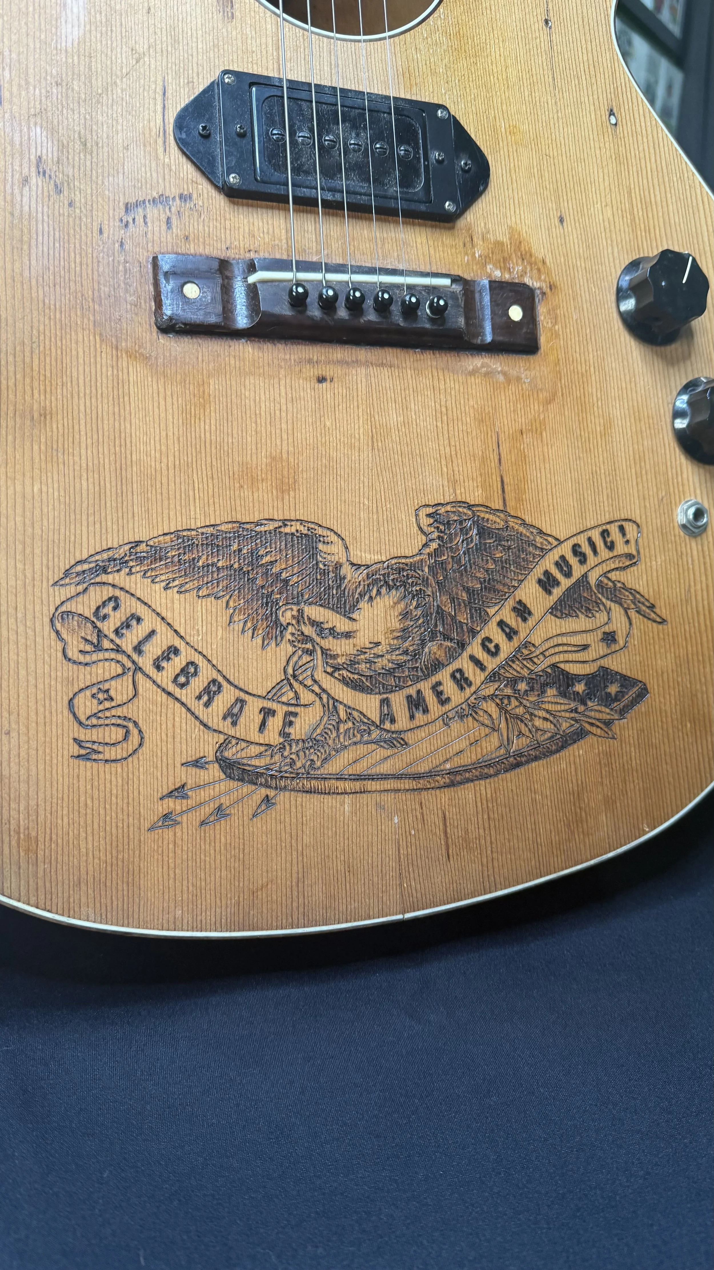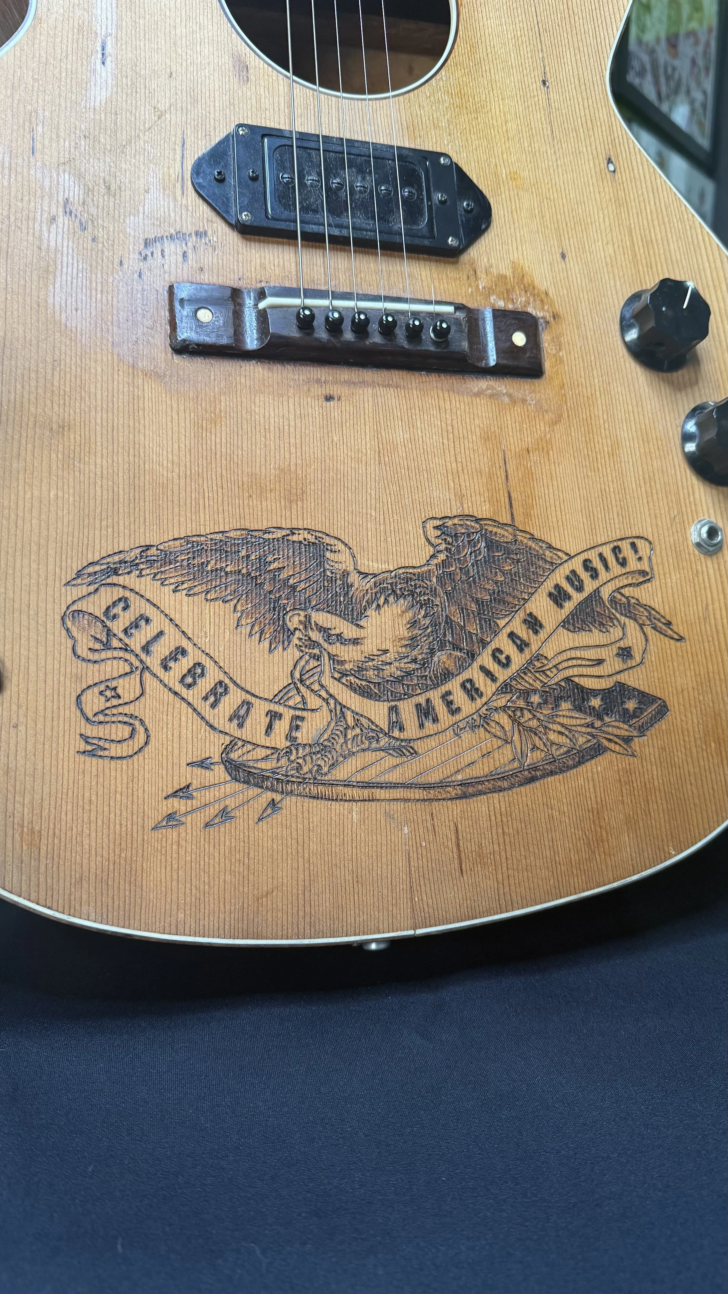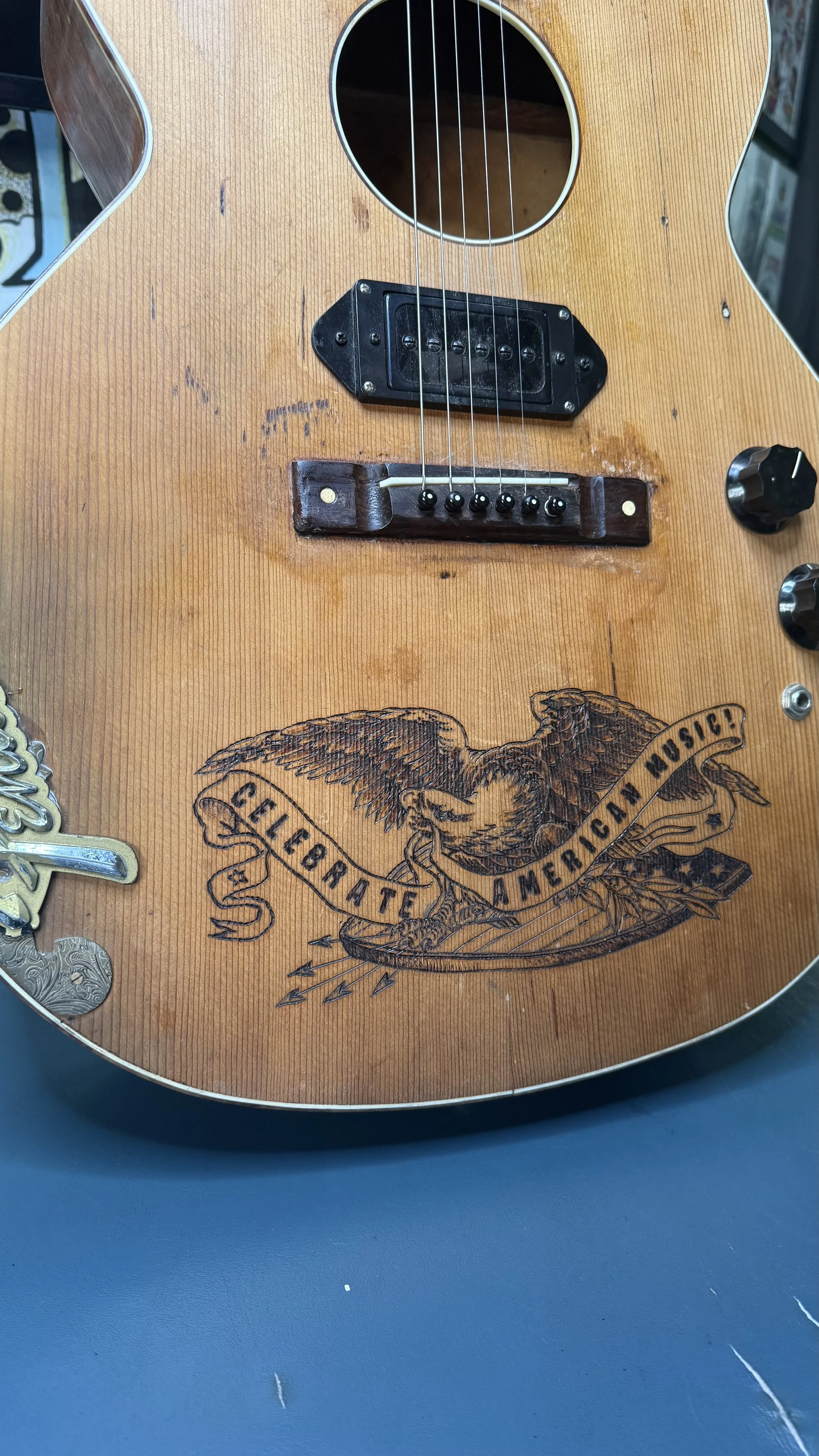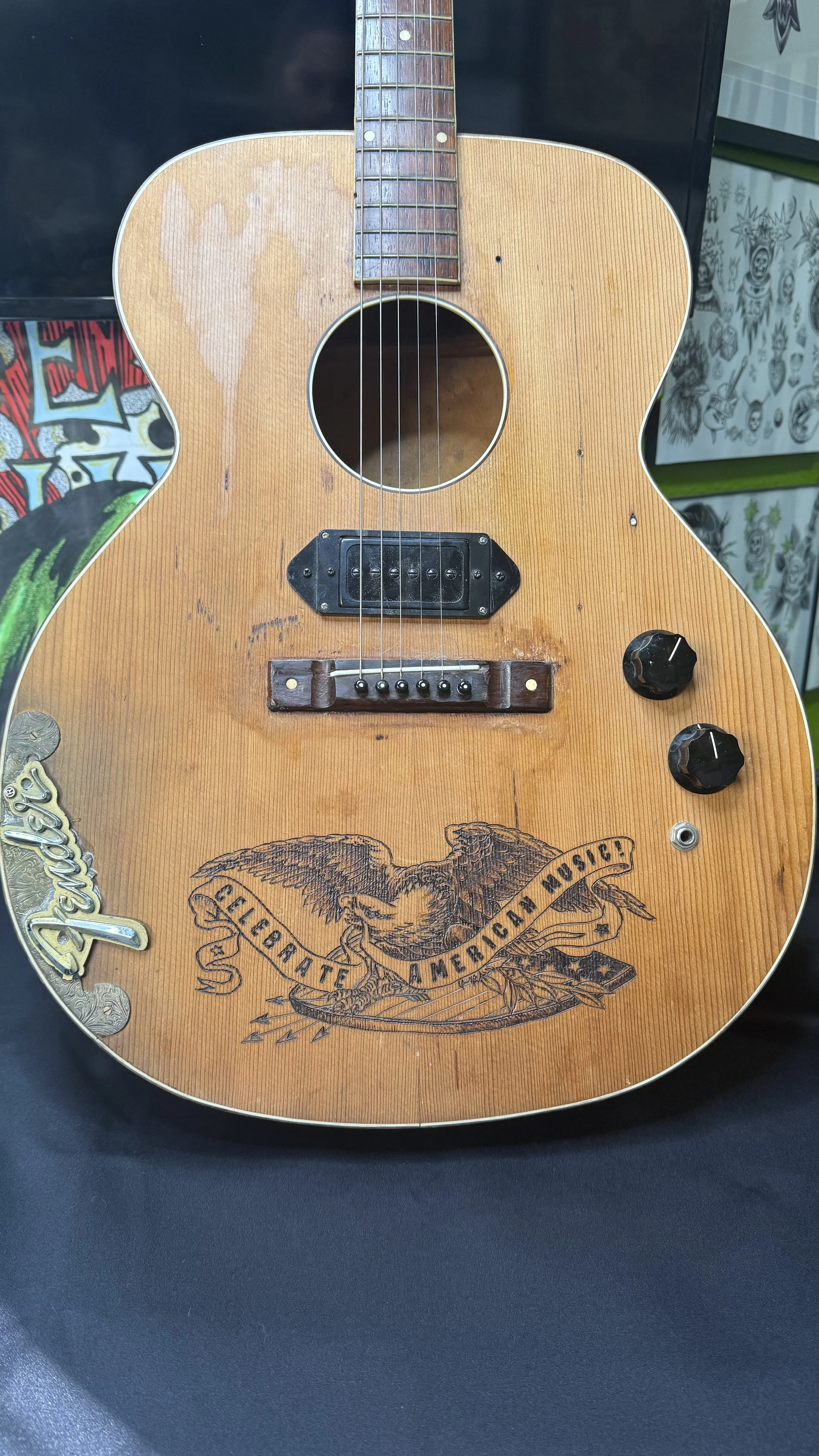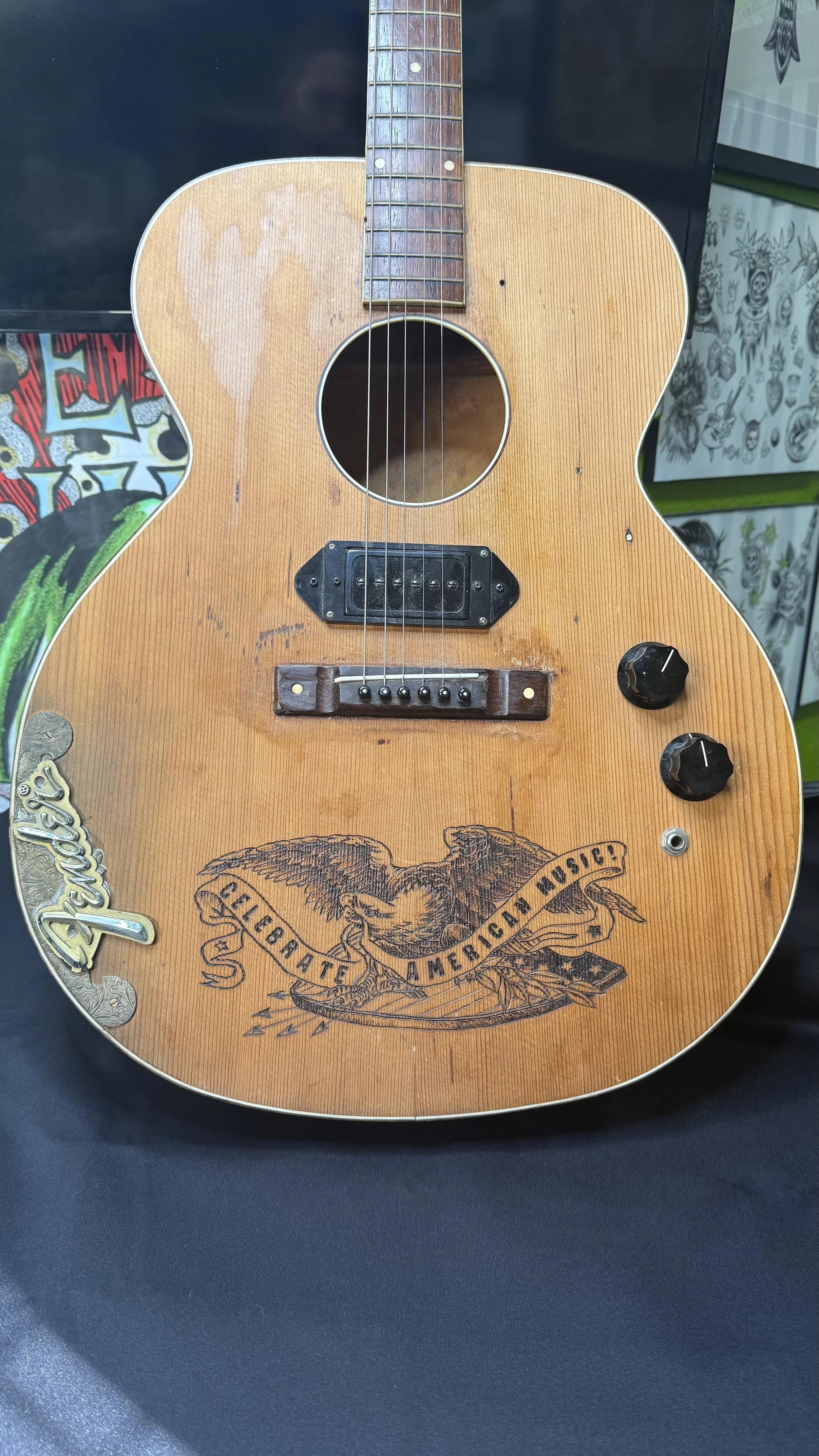 Original Art and prints › Woodburn on acoustic guitar Image 1 of 5 Image 2 of 5 Image 3 of 5 Image 4 of 5 Image 5 of 5 Woodburn on acoustic guitar $150.00 sold out Requested traditional Americana design wood burned on this acoustic guitar. Sold Out Added! Requested traditional Americana design wood burned on this acoustic guitar.